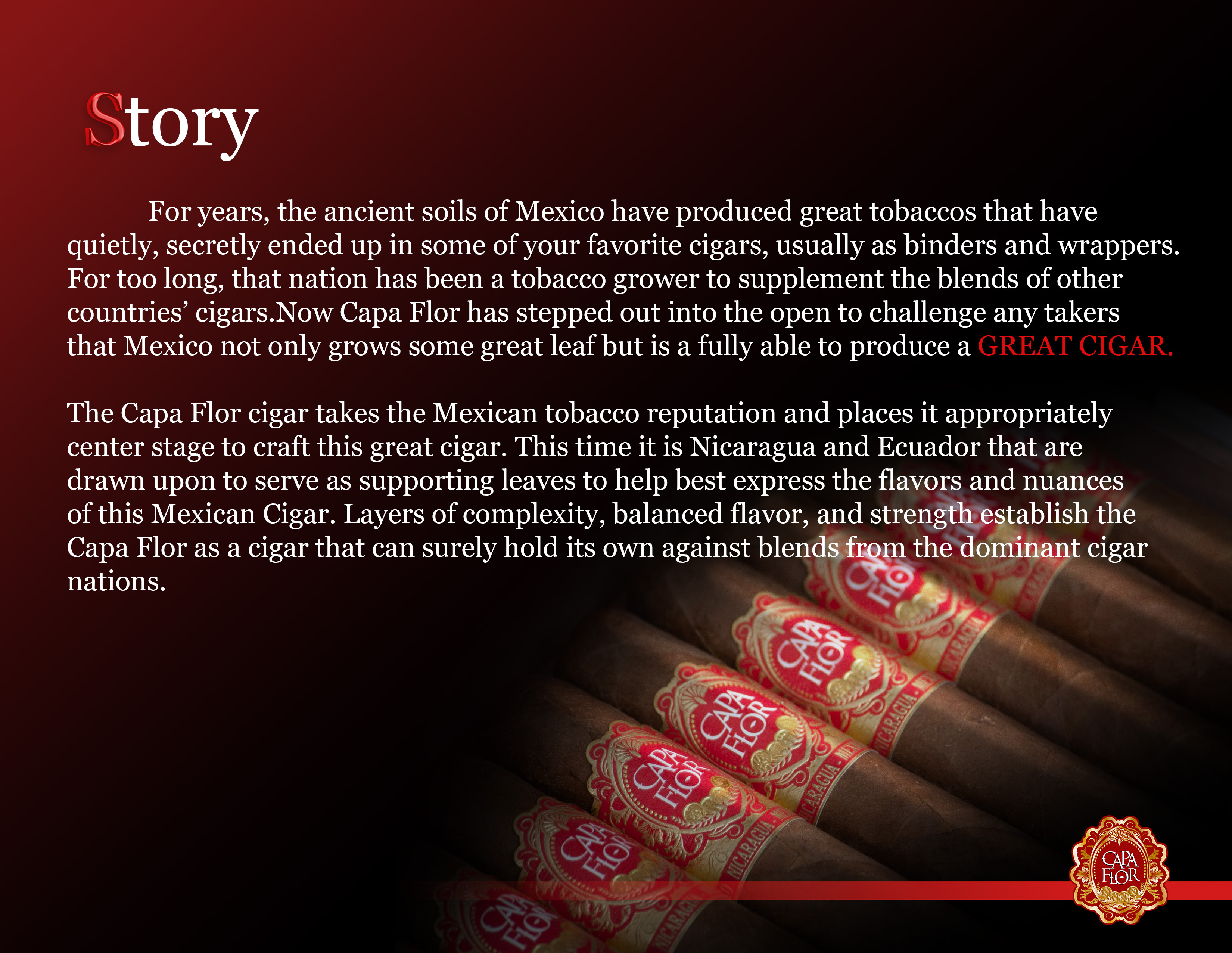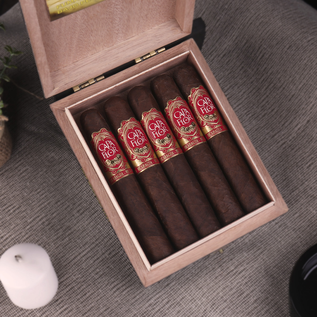 Capa Flor is a celebration of refinement — a cigar designed for moments of calm, conversation, and appreciation. Its carefully selected tobaccos create a smooth, approachable profile, layered with subtle floral notes, cream, and light spice. The experience is gentle yet complex, making it ideal for both newcomers and seasoned smokers seeking balance. Every detail, from construction to presentation, reflects a philosophy of elegance. Capa Flor is not about intensity — it is about nuance, sophistication, and timeless appeal.